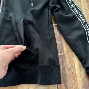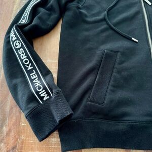 Michael Kors women’s logo striped black hoodie with zipper, front slide pockets, drawstring hood. Wonderful quality seen in fabric and zipper. A somewhat heavier sweatshirt great for transitional time of year. Excellent new condition no tags. Fast shipping.