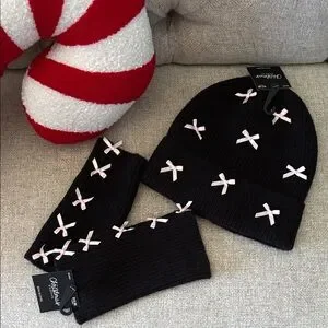 Black Beanie and Glove Set with Pink Bows