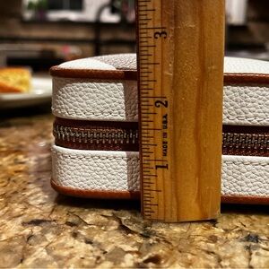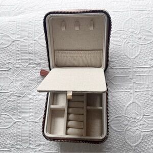 NWOT Mark & Graham Concourse Jewelry Case in cognac and white vegan leather, new without tags. I believe this style is no longer sold in the travel case, and features a compact, travel-friendly design with compartments to keep jewelry organized and secure. Clean, unused, and hard to find in this color combo!