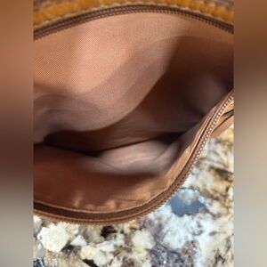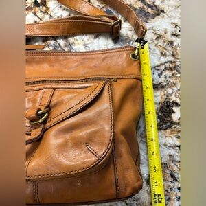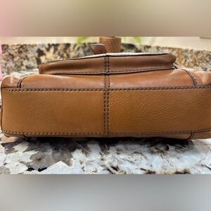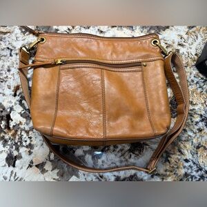 Elegant tan leather messenger bag. Features front zipper pocket and adjustable strap. Ideal for daily use. Well loved but still a great well made bag with chunky hardware durable has a few spots on the front of the bag adds to the used look a few ink spots inside if you love this make me an offer has a great adjustable strap crossbody is a great versatile bag that will last! Fossil is known for its durability