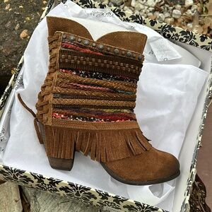 Stylish brown ankle boots with fringe detail. Features colorful woven accents. Perfect for casual wear.