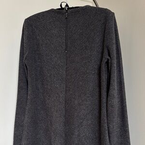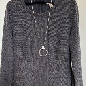 This elegant gray dress is perfect for any occasion. Its basic style enables you to add jewelry or a scarf to enhance the look in anyway you want. The piece that runs down the front from top to bottom creates a nice change in the pattern. Necklace shown in the picture is not included. Perfect condition.