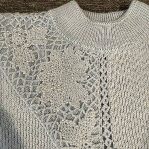Cozy and charming, this Jaclyn Smith long-sleeve embroidered sweater features beautiful floral detailing with small beads that gives off strong cottagecore and grandmacore vibes. Soft, comfortable, and perfect for layering through fall and winter.