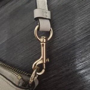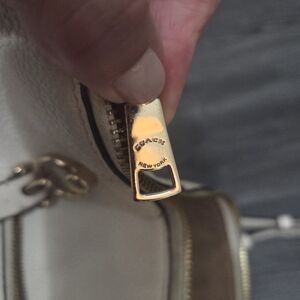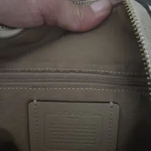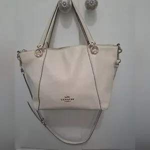 Chic Coach shoulder bag in cream leather. Features gold-tone hardware and elegant design. Perfect for daily use.