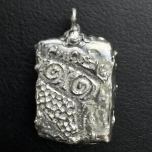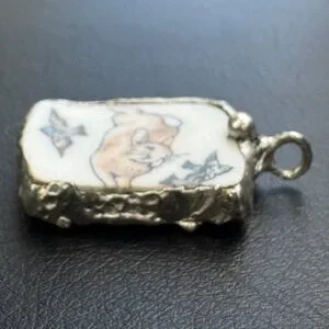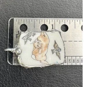 Once upon a time, a shattered Wedgwood Peter Rabbit plate found its way into a silversmith's hands. With care, it was transformed into this enchanting pendant. One side tells a tale with a painted bunny and birds, while the other reveals textured artisan metalwork.