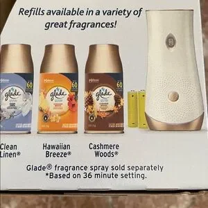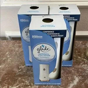 3 Glade automatic spray holders. Sleek design. Keeps spaces fresh. Time release spray