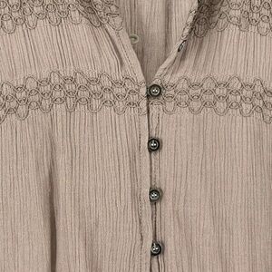 Bohemian Bell Sleeve Blouse V Neck Taupe Tapered Flare Sleeve Button Front Relaxed Fit Embroidered Casual Top She + Sky Brand High Low Hem Festival Chic