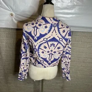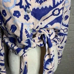 Stylish long-sleeve top with a vibrant blue and pink pattern. Features a tie-front design and classic collar.