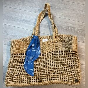 Billabong Woven Tan Tote Bag with Blue Tie Accent