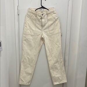 Stylish cream high-waisted pants. Features front pockets and button closure.