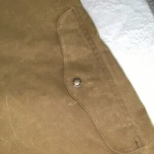 This vintage (women's?) Filson Tin Cloth Upland Game Field Jacket in size Medium is a mid-length jacket made in the USA. It features a tan cotton outer shell with a classic Filson style, perfect for outdoor activities. The jacket includes a rear game pocket and multiple other pockets for convenience and functionality, making it ideal for hunting or other outdoor adventures.