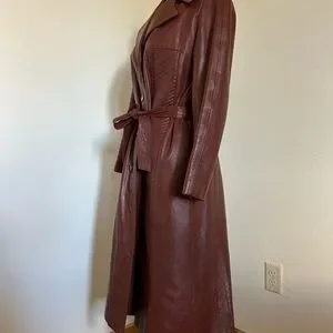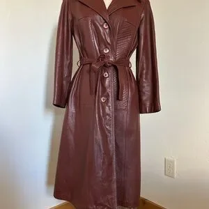 Classic vintage genuine leather trench coat in a rich brown color. Features a button-front closure, wide collar, waist tie belt, and full black lining. Unbranded.
