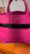pink with black bow, has crossbody detachable Strap, polka dot interior