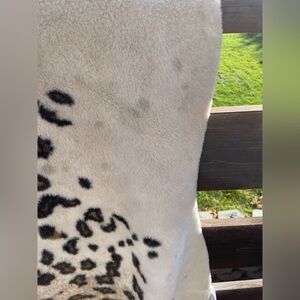 Gorgeous leopard print area rug with faux suede backing. It is freshly washed however I did not notice the spots in the picture, I did not treat them so am not sure if they will come out but I assume they will. The corner of the backing is detached as well, please see photo. It is super easy to clean since it is machine washable and it really comes out beautifully and is very soft. Adds romance to the room🩷 it has no bad smells nor any patchiness, it is in my opinion, in good condition.