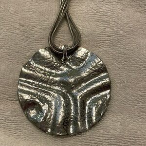 This elegant silver plated pendant necklace adds a touch of sophistication to any outfit as a statement piece. The necklace is 15.5” long and could extend extra 4”. Pendant is 2.5” in diameter