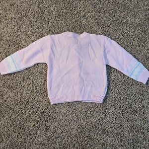 Adorable vintage-style pastel knit cardigan for toddler girls, size 3T. Features a sweet cottage and cat design on the front with soft pastel colors (pink, lavender, blue, & mint). Button-down front with mother-of-pearl-style buttons. Perfect for spring, photos, or everyday wear.