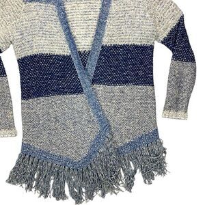 Lucky Brand Cardigan Women L Blue White Fringe Boho Tunic Fuzzy Cottage Sweater