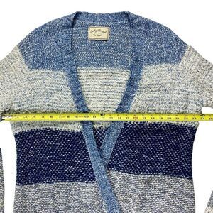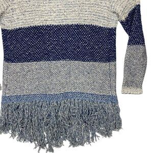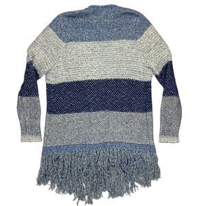 - Description: Lucky Brand Cardigan Women L Blue White Fringe Boho Tunic Fuzzy Cottage Sweater
