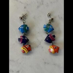 Handmade Vintage 80's Wooden Colorful Fish Dangle Earrings