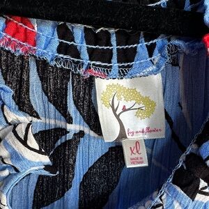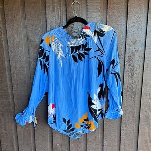 Vibrant blouse with floral design. Features blue, red, and orange hues. Perfect for casual wear.