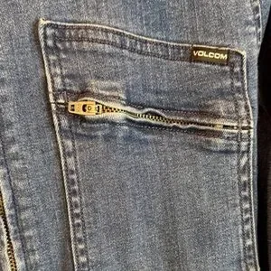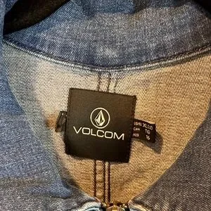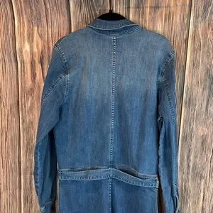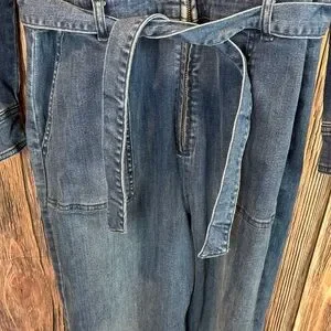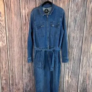 Chic dark blue denim jumpsuit with front zipper. Features chest pockets and a tie waist. Ideal for casual outings.