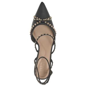 Chic black heels with stylish gold studs. Features a pointed toe and ankle strap. Ideal for a night out.