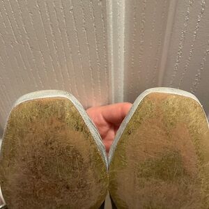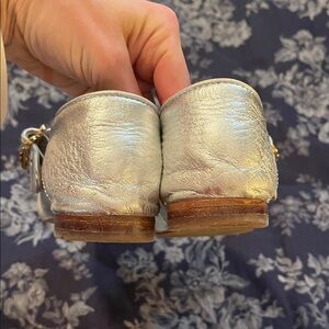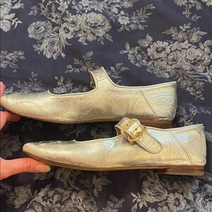Chic silver Mary Jane flats with a classic buckle strap. Ideal for versatile styling.