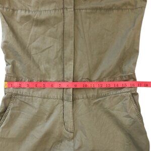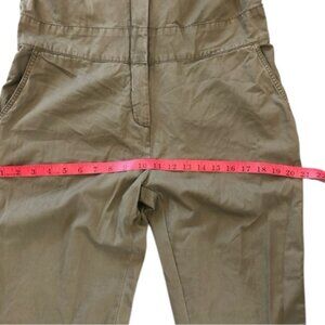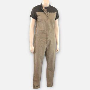 Lightweight cotton jumpsuit in light khaki olive with contrasting darker khaki green on shoulderssleeves
