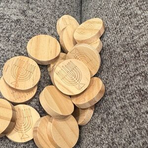 Set of wooden tokens featuring menorah design. Comes with a drawstring pouch for easy storage.
