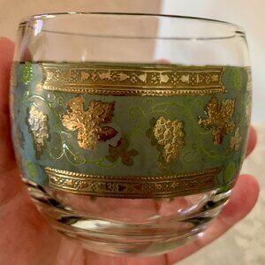 This is a set of 4 preowned Vintage MCM Hollywood Regency 1950s Low Ball Cocktail Stemless Wine Roly Poly Glasses with 22k Gold Accents of Grapes and Bunches of Grapes. Made by Cera Glass Company. They hold approximately 8oz. They are in great vintage condition. No chips or cracks.