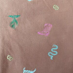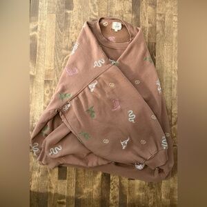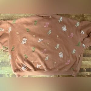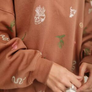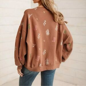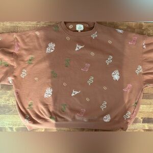 Cozy, stylish, and perfectly western-inspired! This Sterling & Stitch sweatshirt (sold at Buckle) features a soft brown base with embroidered western graphics including boots, snakes, longhorns, and desert details. It has a relaxed fit with roomy sleeves, making it great for everyday wear. Gently used and still in excellent condition with no stains or flaws. Perfect paired with jeans, boots, or layered for a cute boho-western look.