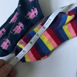 This is a great sock bundle for girls! It includes two pairs of colorful striped socks and one pair of ankle socks with a fun print. Please see the pictures for measurements and condition details. These socks are sure to add a pop of fun to any outfit!