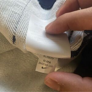 In good pre-owned condition, not too many signs of wear. There is a white stain near pocket, might come out in the wash. The outline of the swoosh & crest is white, because of the fabric. One of the drawstrings has a small sticky residue on the tip