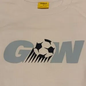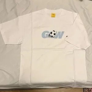 White t-shirt with a blue and black graphic design. Features a soccer ball motif. Men’s size small. Brand-new, never worn. In original packaging - just opened to photograph.