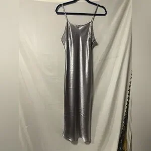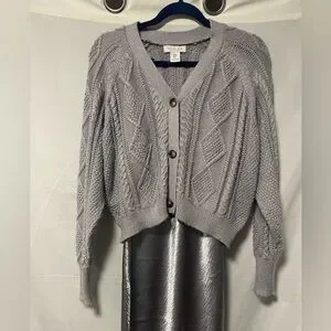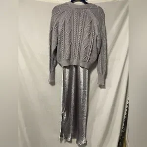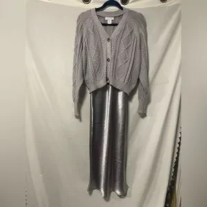 This stylish set features a cozy gray knit cardigan paired with a sleek silver dress. Perfect for any occasion, this ensemble combines comfort with elegance.