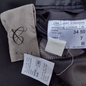 Elegant Canali NWOT peak-lapel tuxedo jacket in a dark charcoal micro-texture wool with satin lapels. Single-button front, dual vents, and full Cupro lining. Luxury Italian tailoring perfect for weddings, black-tie events, galas, and formal occasions. Retail ~$1,500+. Rare NWOT find.