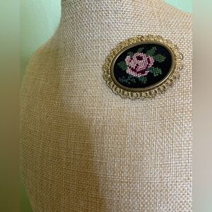 Elegant Gold and Black Floral Brooch with an embroidered pink rose