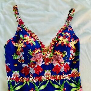 Marchesa Notte; Size 6; vibrant blue floral, full length gown, embroidered flowers appliquéd on delicate straps, V-neck plunge with vanity netting at V; front slit in skirt, hidden zipper center back; purchased for a wedding but forgot to return! New with tags, never worn. Beautiful!