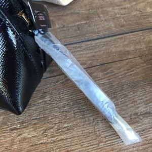 Black cosmetic bag with rosegold laser underlay, scalloped edge, full zippered closure, and fully lined
