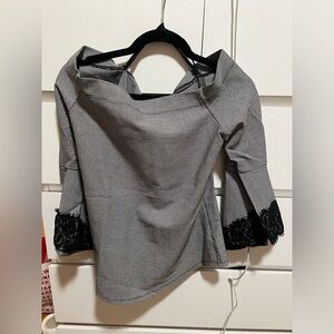 Elegant gray top and pants set. Features black lace cuffs. Perfect for a chic look.