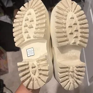 Gucci rubber platform slides in a size 38. Worn twice. Scuffs shown. Authenticated and purchased from TheRealReal 3 years ago. Closet cleaning , great purchase for anyone who loved but didn’t want to splurge on them.