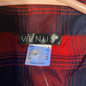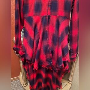 Vibrant plaid shirt with button-down style. Features red and black pattern. Ideal for casual wear. This item is a VENUS red and black plaid high-low top (also described as a blouse, tunic, or shirt dress), which typically features a frayed or raw hem and an asymmetrical hemline. It is made of a soft material.
