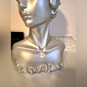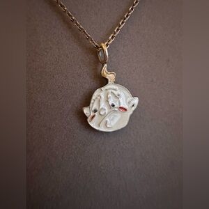 Features a charming enamel “cry baby” face pendant with soft white enamel, red blush details, and a tiny gold-tone curl of hair at the top. Pendant is stamped Dior”and 925 on the back, confirming authenticity. The necklace comes on its original silver-tone chain and includes a Christian Dior velvet pouch for storage or gifting.