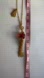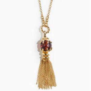 Long necklace in metal chain with tasseled pendants, one with a marbled plastic stone. Adjustable length with trigger clasp.