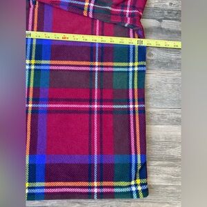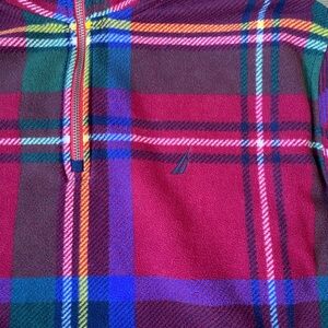 Vibrant plaid sweatshirt with a half-zip design. Features bold red and blue colors. Ideal for casual wear.