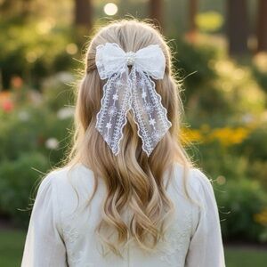 Beautiful white lace hair bow with floral patterns in french barrette clip. Clip size 3 inches and bow sizes are 5 inches and 4 inches. Perfect for adding a touch of elegance to any hairstyle. Great for Bridal , First communion or any special occasions. Handmade and New without tag.