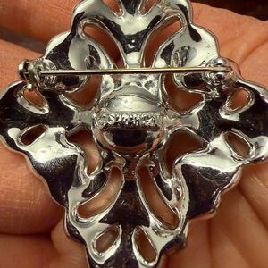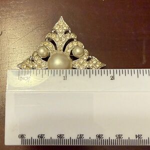 vintage Sarah Coventry "Persian Princess" brooch featuring a silver-tone setting with clear rhinestones and faux pearls.