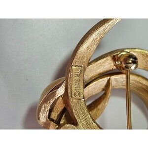 Pretty gold colored brooch is abstract. It is marked Trifari with a crown over the T.