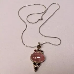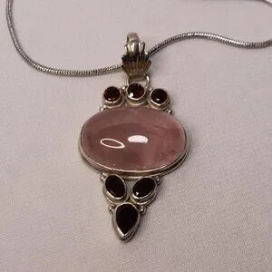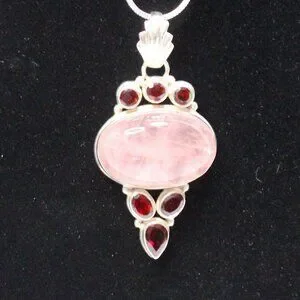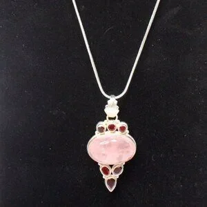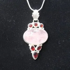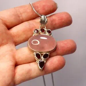 Sterling Silver Rose Quartz Gemstone and Red Glass Stone Necklace