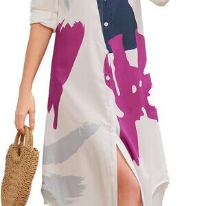 Features: This flowy maxi shirt dress is made from lightweight polyester, giving it a comfy, breathable feel perfect for warm days or layering. It has a relaxed, loose fit with a button-front closure, collared V-neck, long sleeves with button cuffs, front chest pocket, and an irregular pattern that adds a stylish touch. Can be dressed up or down — tie it with a belt for a more fitted look or wear it loose for relaxed vibes.
